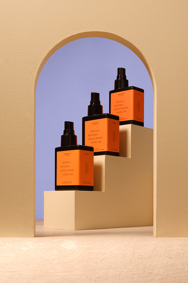 Namaskar Ayurveda, an Indian cosmetics brand, is dedicated to creating high-quality products with clean, natural ingredients rooted in Ayurveda. The brand identity of Namaskar Ayurveda seamlessly blends Indian roots with a minimal aesthetic, achieving a contemporary and modern look. The typographically driven identity system creatively combines typefaces to enhance visual presentation through shapes and text breaks. The warm colour palette, inspired by Indian spices like Haldi, saffron, and red chilli powder, along with a fresh lilac tone, creates a balanced and distinctive brand identity. The attention to detail extends to the selection of frosted coloured glass jars with screen print and custom-designed black matte squared bottles, enhanced by coloured labels that showcase our brand colours. As part of a comprehensive global identity project, I undertook production, art direction, and creative photography for Namaskar products, meticulously aligning every scenario with the brand identity.